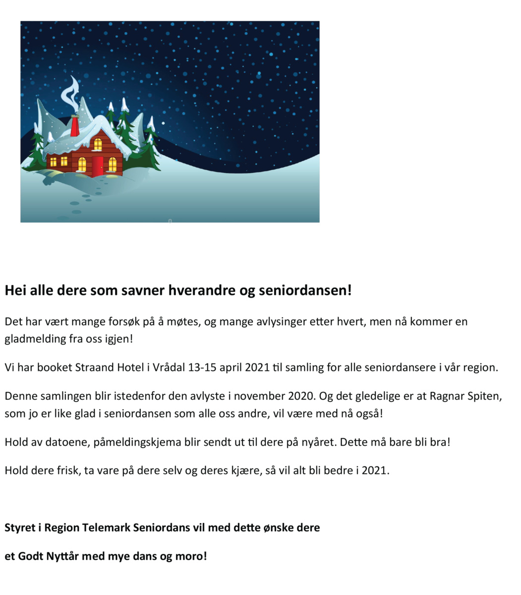 1.februar 2021Vi må dessverre avlyse årsmøte for SN-Region Telemark den 05.02.2021. Dette pga. korona restriksjoner. Det samme gjelder for danseledersamlingen. Ny dato for årsmøte er satt ... Les artikkel ⟶